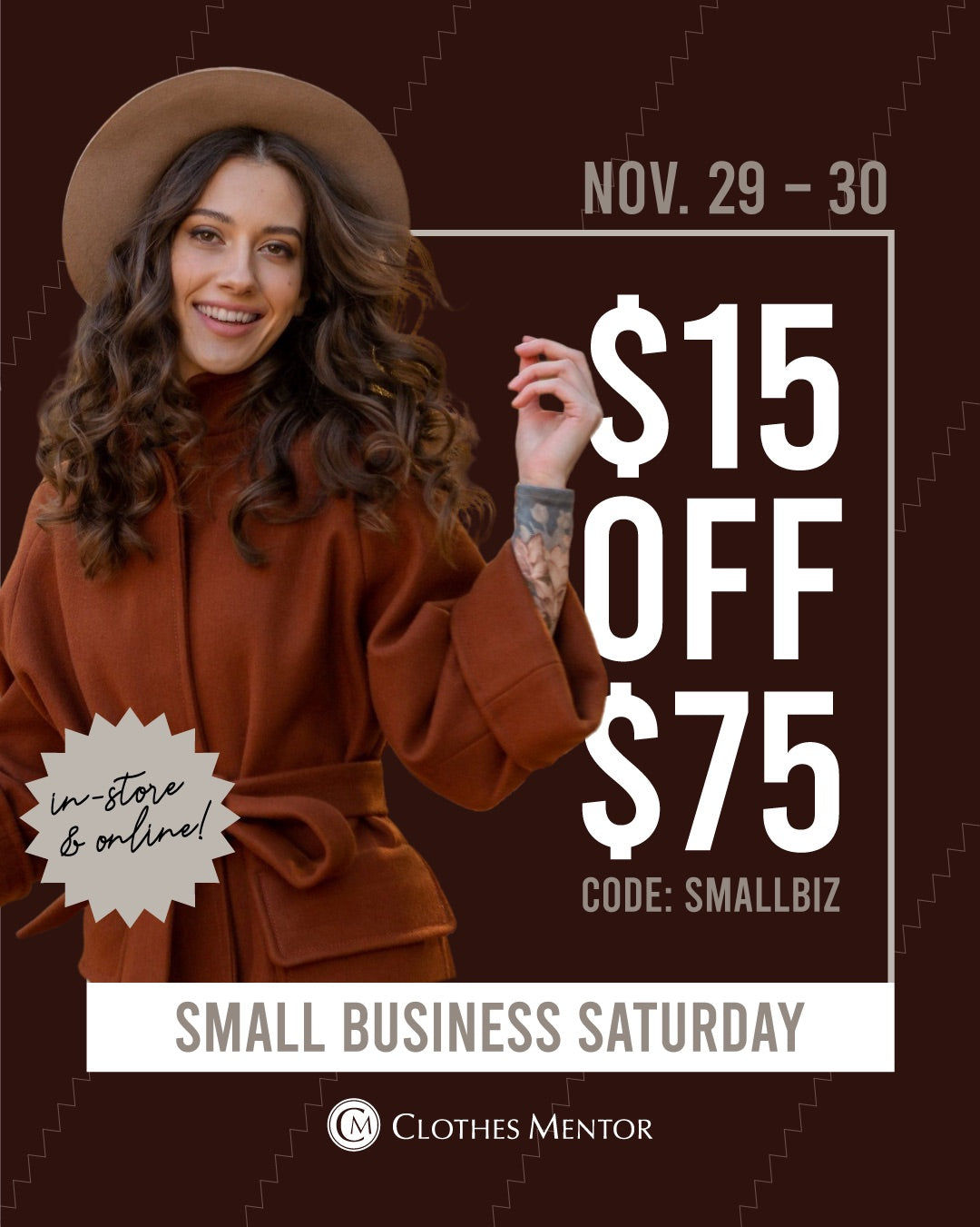 In-Store and Online Sat. & Sun (11/29 - 11/30) get $15 OFF any $75 purchase. Come support local!!